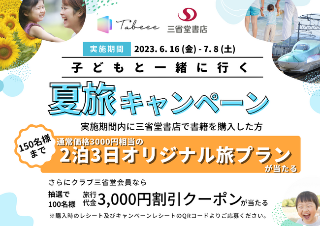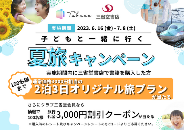 詳細:クラブ三省堂会員、もしくは、キャンペーン期間中に三省堂書店指定店舗(池袋店/有楽町/成城店)で書籍を購入した方で、QRコードよりTabeeeの公式LINEに登録してくれた方の中から抽選で100名様に通常価格3000円の2泊3日のオリジナル旅プランを無料提供します。