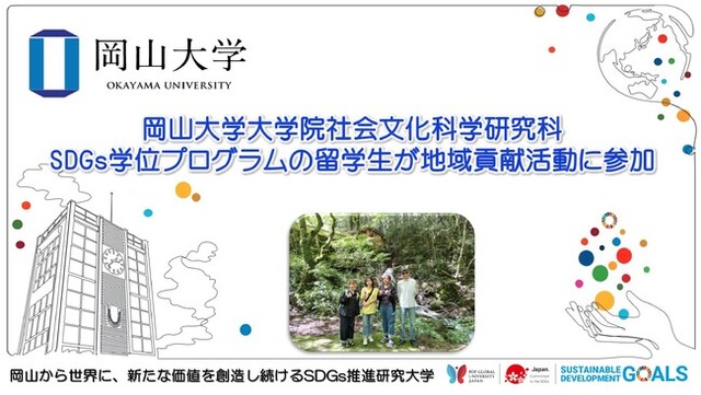国立大学法人岡山大学(本部:岡山市北区、学長:那須保友)の大学院社会文化科学研究科SDGs学位プログラムの学生4人が、2023年6月3日、岡山県久米南町にある七面滝で、久米南町産業振興課、及び地域の関係者の支援の元、美化活動を行いました。