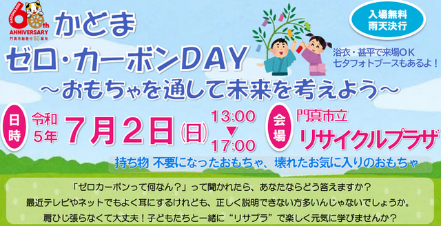 門真市では温室効果ガスの削減をめざすため、7月2日(日曜日)に環境イベント「かどまゼロ・カーボンDAY~おもちゃを通して未来を考えよう~」を開催します。