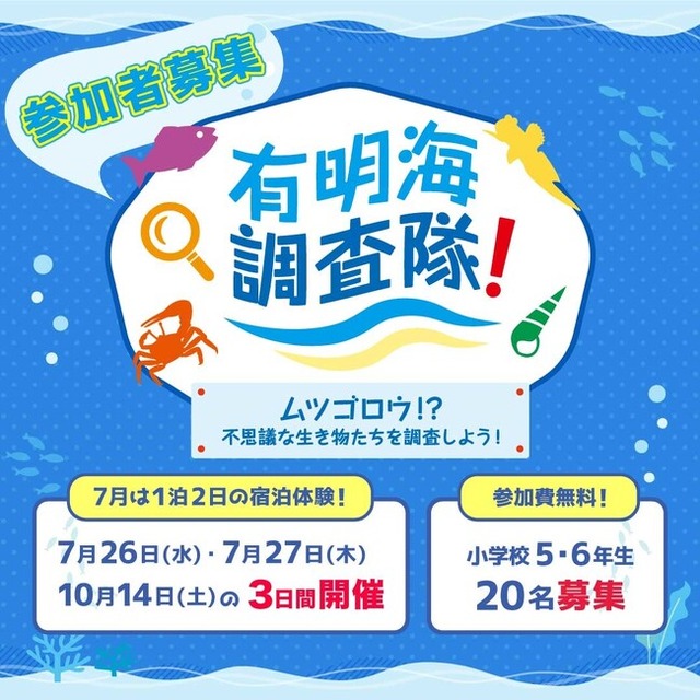 有明海の干潟についてプロフェッショナルな講師陣による体験学習プログラムを企画し、福岡県内の小学5・6年生を対象に20名の参加者を募集中です。