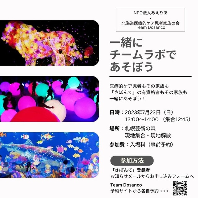 2021年に「医療的ケア児支援法」が施行され、行政、保育園、幼稚園、学校では、医療的ケア児を受け入れられる体制づくりが進められています。在宅で暮らす医療的ケア児者は増えており、インクルーシブな社会のためには、大人も子どもも医療的ケア児者との接点を多くもつことも重要です。接点づくりとして、NPO法人あえりあと北海道医療的ケア児者家族の会Team Dosancoのコラボで、札幌芸術の森に来るチームラボで一緒にあそぶ機会を企画しました。