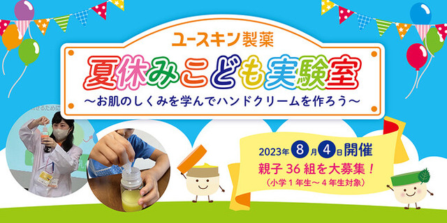 ユースキン製薬株式会社(本社:川崎市川崎区、代表取締役社長: 野渡和義)は、夏休み期間中の2023年8月4日(金)に、ユースキン製薬・本社(川崎市川崎区)にて、お肌のしくみを学び、ハンドクリーム作りを体験できる親子イベント『ユースキン夏休みこども実験室!~お肌のしくみを学んでハンドクリームを作ろう~』を開催します。