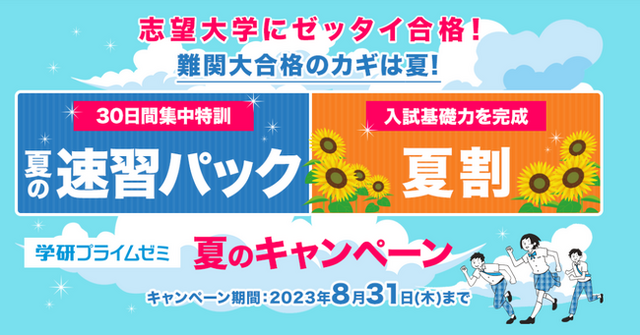 株式会社 学研ホールディングス(東京都品川区/代表取締役社長:宮原博昭)のグループ会社、株式会社 Gakken(東京都品川区/代表取締役社長:五郎丸徹)は、学研のプライム講座の難関大受験対策向けオンライン映像授業「学研プライムゼミ」において、2023年6月19日(月)より、夏限定の速習パック、および夏向け講座の特価販売による「夏のキャンペーン」を実施します。