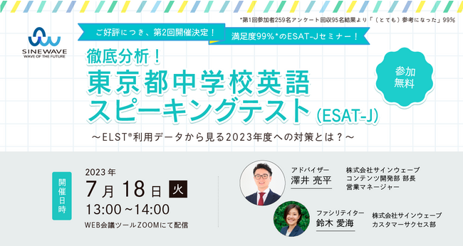 全国の学習塾と私学向けにAIテクノロジーを活用した英語4技能対策アプリ「ELST(R)︎」シリーズや、一般ユーザー向けのペン型スキャナー辞書「NazoritAI Pro(ナゾリタイプロ)」を提供する株式会社サインウェーブ(所在地:東京都千代田区、代表取締役:赤池雅光、以下サインウェーブ )は、学習塾の方々を主な対象とした無料オンラインセミナーを、7月18日(火)の13:00~14:00で開催いたします。プログラムは2023年5月30日に行った内容に加え、ELST(R)の東京都中学校英語スピーキングテスト(ESAT-J)対策コンテンツ改修後のインターフェイスのご紹介など、一部最新情報を含む予定となっております。