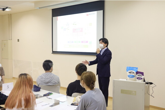 今回は、レシピ開発に向けたセミナーとして、新入生を中心にゼラチン・アガーの原料や使い方を講義した他、新田ゼラチンが今年から取り組んでいる「フレイルFREE Project」についても紹介をしました。