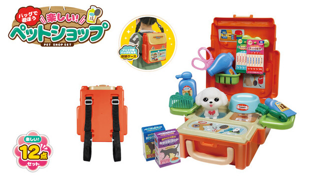 特徴:ハサミやドライヤー、ペットフードなどリアルな小物を使ってペットショップごっこ♪バッグを広げて、たくさんの小物を使って自分だけのお店を開店してみよう。リュック型のケースで持ち運びが楽々、いつでも一緒におでかけできて嬉しい!
