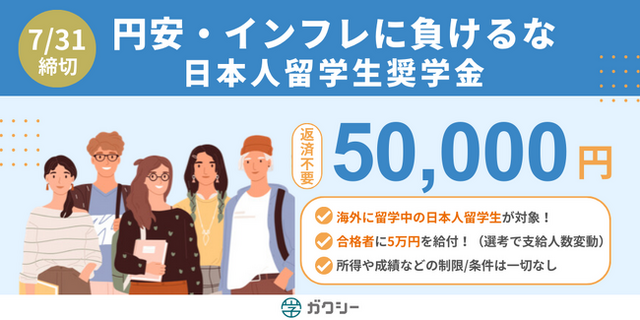 日本最大の奨学金プラットフォームを運営する株式会社ガクシー(本社:東京都港区、代表取締役:松原良輔、以下ガクシー)では、円安や世界的なインフレに大きな影響を受けている、現在海外に留学中の日本人学生に対する緊急支援を目的に、オリジナル奨学金『円安・インフレに負けるな!日本人留学生奨学金』を設立。本日より2023年7月31日までの期間、奨学金情報サイト『ガクシー』(https://gaxi.jp)にて、学生からの応募を受け付けます。