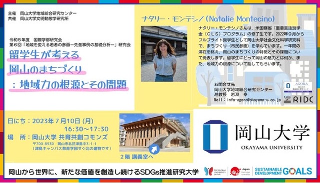 今回、2023年7月10日(月)16:30~17:30に本学津島キャンパスにおいて、米国務省「重要言語奨学金(CLS)プログラム」修了生であり、現在フルブライト奨学生として岡山大学社会文化科学研究科で市民参画を学んでいるナタリー・モンテシノさんが語る、岡山のまちづくりの特徴や課題、留学生にとっての岡山の魅力などについて発表します。
