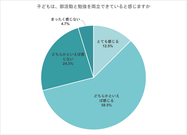 保護者に、子どもが部活動と勉強を両立できていると感じるかを聞いたところ、12.5%が「とても感じる」、58.5%が「どちらかといえば感じる」と回答した。