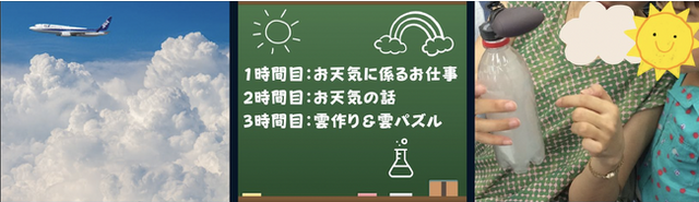 ANAブルーベース(東京都大田区)で実施する「会場開催」へのご参加者は、オンライン講座を視聴いただいた後に、一般社団法人気象予報士学会サニーエンジェルス様の協力のもと、「ペットボトルで雲作り」や「雲パズル」の体験学習をお楽しみいただけます。