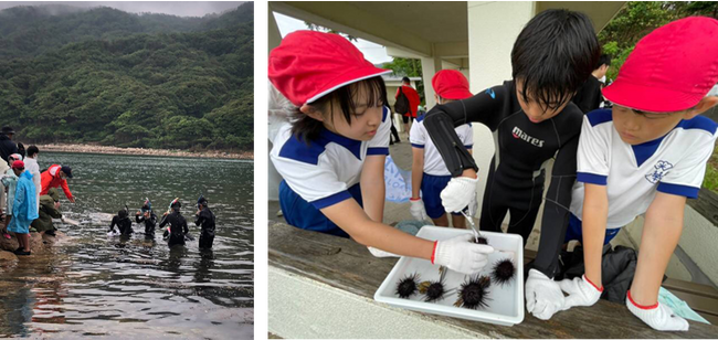 京都大学 フィールド科学教育研究センター舞鶴水産実験所の益田教授による京都大学舞鶴水産実験所前の舞鶴湾での潜水実演にて、採れた生き物や海藻の観察を行いました。子どもたちは、海で採れた生き物を教授から受け取り、実際に、生き物と触れ合いました。