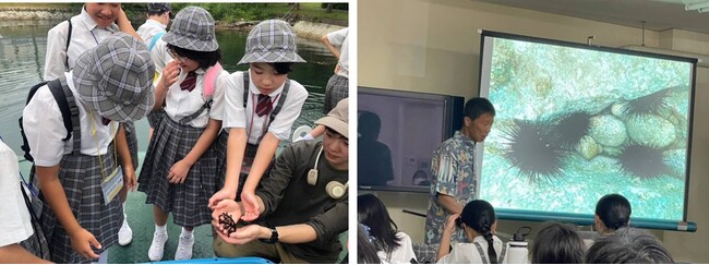 後半は京都大学舞鶴水産実験所で進められている海を守るための研究を見学し、舞鶴湾の生態系で起こっている異変について学びました。海藻を食べるウニが増えて磯焼けが起こっている現状を学び、翌日のウニの捕獲・解剖体験へと繋げます。