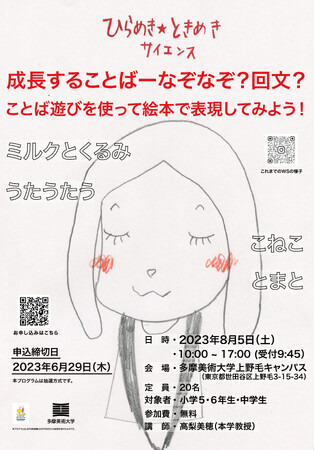 多摩美術大学(東京都世田谷区/八王子市、学長:内藤廣)は科研費プログラム「ひらめき☆ときめきサイエンス」の一環として、全国の小学5・6年生・中学生対象としたワークショップ「成長することばーなぞなぞ?回文?ことば遊びを使って絵本で表現してみよう!」を開催いたします。