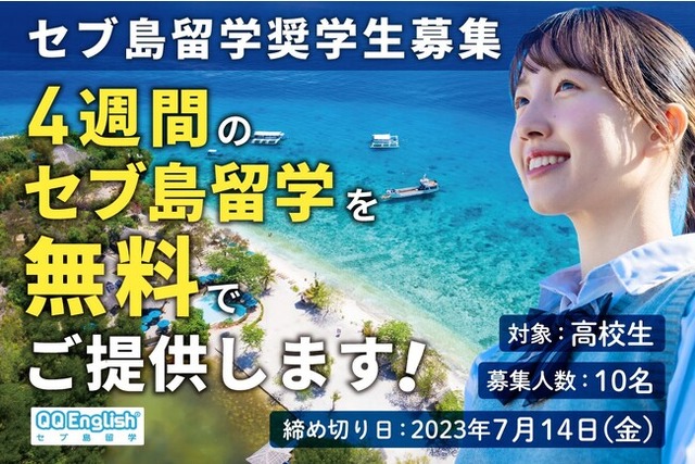 株式会社QQEnglish (本社:東京都渋谷区、代表取締役:藤岡 頼光)が提供するセブ島への留学留学にて、2023年6月23日より、高校1年生~3年生を対象に、最大4週間分(2023/7/23~2023/8/31)の留学費用をQQEnglishが負担をする「セブ島留学奨学生募集」を開始したことをお知らせいたします。