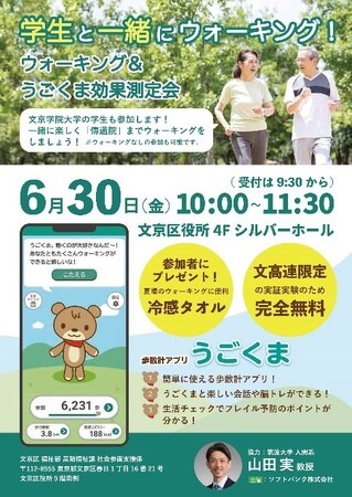 文京学院大学(学長:福井勉)は、人間学部で主に福祉を学ぶ学生有志12名が、文京区高齢福祉課とソフトバンク株式会社と連携した高齢者向けウォーキングイベントに6月30日(金)、参加することをお知らせします。
