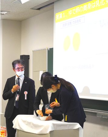 乳化の原理と素材・工程による違いや、マヨネーズを冷凍や加熱することによる乳化の安定性に与える影響など、普段調理をする工程で出てくる具体的な例など交えて、わかりやすく講義を行いました。