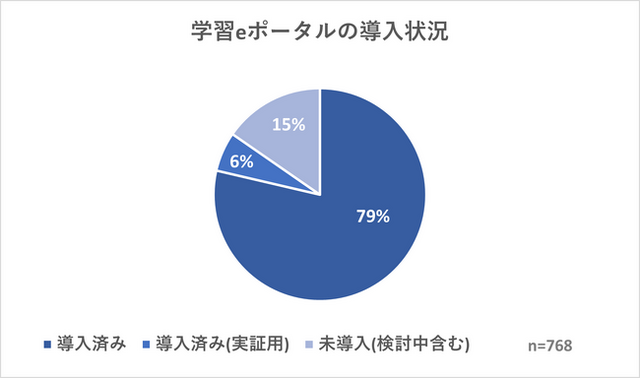 全国768自治体に学習eポータルの導入状況を聞いたところ、導入していると答えたのは604自治体(79%)、実証用を導入していると答えたのは46自治体(6%)、導入していないが118自治体(15%)。(n=768)