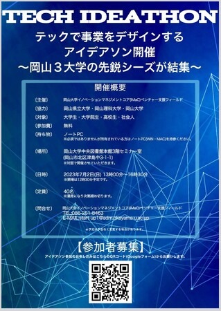 国立大学法人岡山大学(本部:岡山市北区、学長:那須保友)岡山大学イノベーションマネジメントコア(IMaC)ベンチャー支援フィールドは、岡山大学・岡山県立大学・岡山理科大学の先鋭シーズが結集するテックアイデアソンを、2023年7月2日(日)13:00~16:30に岡山大学津島キャンパスにある岡山大学中央図書館で開催します。