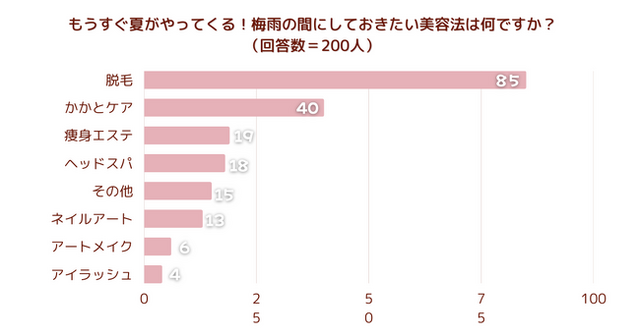 「もうすぐ夏がやってくる!梅雨の間にしておきたい美容法は何ですか?」とアンケート調査した結果、1位は『脱毛』でした。