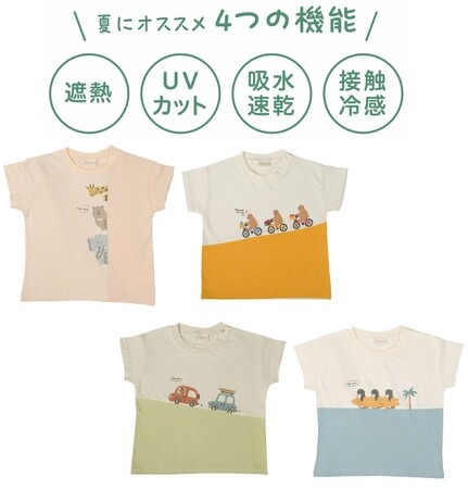 アニマルや乗り物のモチーフに切り替えの配色を活かした楽しいデザインと花柄にレースをあしらったかわいいデザイン。『遮熱・UVカット・吸水速乾・接触冷感』の4つの機能付きで、暑い夏の通園着にもおすすめの一着!