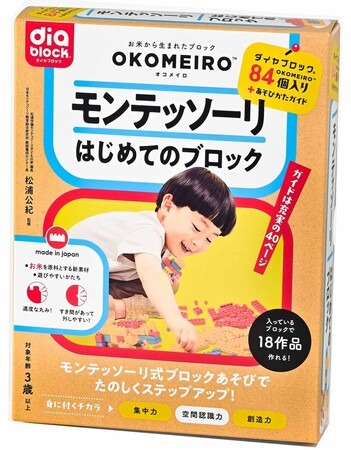 ダイヤブロック(R)「OKOMEIRO(R)(オコメイロ)」は、食用に適さない古米や破砕米を原料としたサステナブル素材を使用した、日本製のブロック。ブロックに適度な丸みがあるため、少ない力で組み立てやすく外しやすく、幼児のはじめてのブロック遊びに最適です。