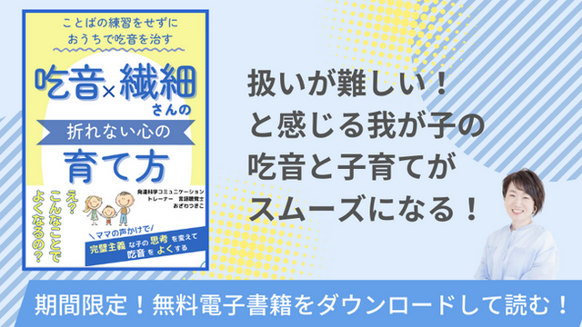 この度、吃音も繊細な面もあるお子さんで、「扱いが難しい!」と感じている親御さんに向けて、『\ことばの練習をせずにおうちで吃音を治す/「吃音×繊細さんの折れない心の育て方』と題して小冊子をリリースいたしました。