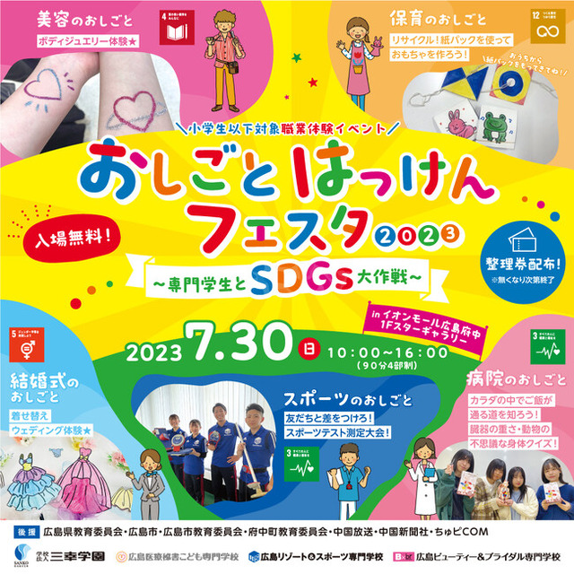 当日は専門学生からこどもたちに向けてSDGs達成目標に関連した「美容・保育・医療・スポーツ・ブライダル」の5つの職業体験を提供いたします。