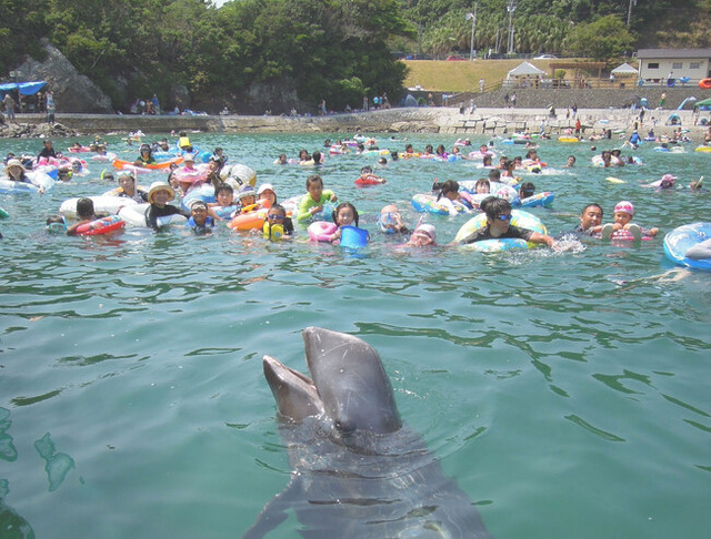 毎年多くの観光客で賑わいを見せる「くじら浜海水浴場」。くじらの博物館から徒歩5分の場所にある畠尻湾(はたけじりわん)奥の小さな海水浴場で、1日2回いけすからクジラが解放され、クジラと一緒に遊泳が楽しめる日本で唯一の海水浴場です。