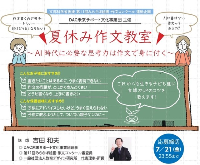 当事業団理事で「第11回みらさぽ絵画・作文コンクール」の作文部門審査委員でもある、国語講師の吉田和夫が、東京・上野の会場とオンライン配信でノウハウをお伝えします。