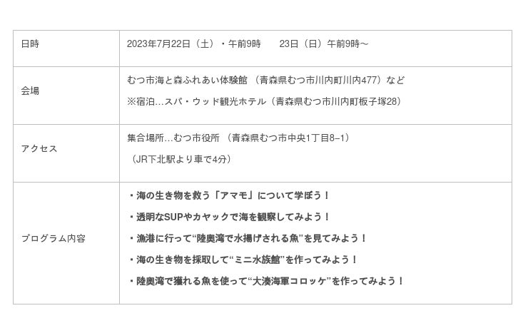 そこでこの夏、県内に住む小学5年生・6年生を対象に「アマモを学ぶ」体験学習イベント「あおもりアマモ調査隊」を企画し、陸奥湾の海の生き物たちを守る「アマモ」について調べ、リアルな青森の海の現状を知ってもらいます。実際に海に入って魚と触れ合い、アクティビティに挑戦するなど、海に関する様々な体験を通して、かけがえのない「アマモ」の大切さを子どもたちに学んでもらい“アマモ場”を守るためのきっかけ作りを行います。