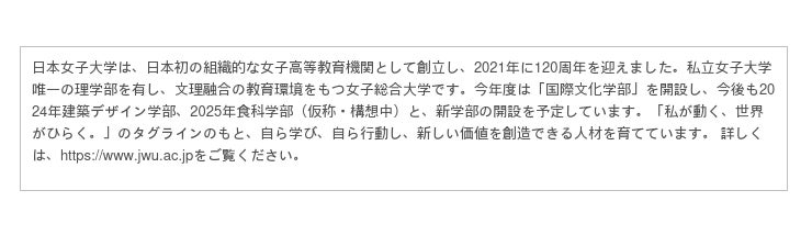 公式ホームページ :https://www.jwu.ac.jp/unv/