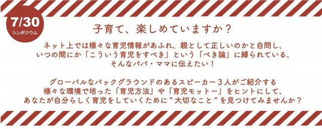 ネット上で様々な育児情報があふれ、親として正しいのか自問し、いつの間にか「こういう育児をすべき」という「べき論」に縛られている、そんなパパ・ママに伝えたいシンポジウムです。グローバルなバックグラウンドのあるスピーカーに様々な環境で培った「育児方法」や「育児モットー」を紹介いただきます。それらは決して特別な方法ではなく、日夜悩むパパ・ママに「自分らしく育児をしていくために”大切なこと”」を見つけてもらえるヒントになるはずです。