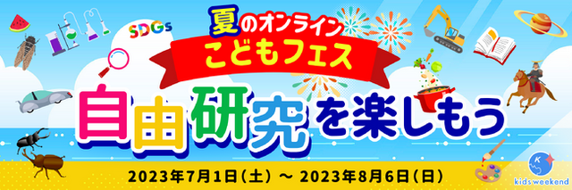 子ども向け「教育×オンライン」の分野で日本最大級のプラットフォームを展開するキッズウィークエンド株式会社(本社:東京都中央区、代表取締役兼CEO:三浦里江、以下、キッズウィークエンド)では、小学生の夏休みを応援する企画として毎年ご好評をいただいている『夏のオンラインこどもフェス ―自由研究を楽しもう』を今年も開催いたします。開催期間は2023年7月1日(土)~8月6日(日)、自由研究のネタやテーマ探しに役立つユニークな授業を多数ラインナップしており、全国の子どもたちはもちろん、親子で楽しめるイベントです。全国どこからでも無料で参加できるので、長い休暇期間を活かしてお子さまの興味関心を親子で探究する機会としてもお薦めです。