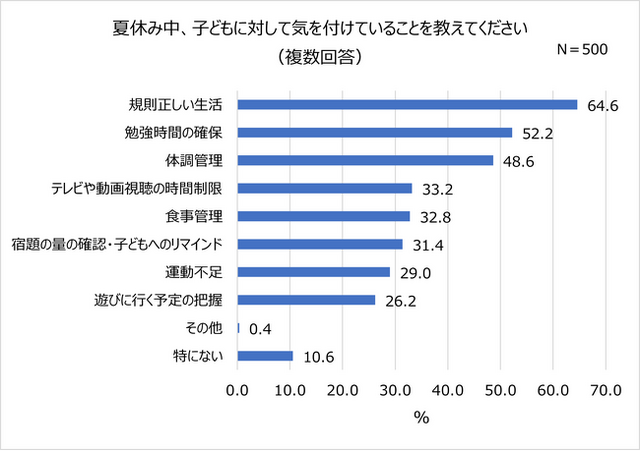 親にとって、子どもと触れ合う大事な時間でもあり、学校がないことで子どものお世話をする時間も増える夏休み。子どもに対して夏休み中に気を付けていることを聞くと、6割以上の親が「規則正しい生活(64.6%)」と回答しました。「勉強時間の確保(52.2%)」や「体調管理(48.6%)」も約5割もの親が意識しており、普段学校に通うことで管理されている生活リズムや勉強時間の確保を、意識的に行っている親が多いことがうかがえました。