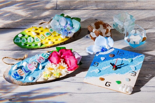 海に落ちたガラスが長い時間をかけて自然と研磨されてできるシーグラスを使い、置時計、インテリアプレート、キャンドルホルダーから2つを選んでデコレーションを体験します。