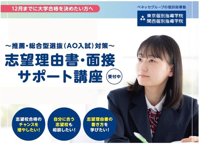 ベネッセグループの株式会社東京個別指導学院(本社:東京都新宿区、代表取締役社長:齋藤 勝己 以下、東京個別指導学院)は、2023年7月1日に、大学入試の推薦型選抜・総合型選抜対策の「志望理由書・面接サポート講座」を、東京個別指導学院と関西個別指導学院の教室で開始します。受験大学のアドミッションポリシー※に沿った志望理由書を書き上げるため、ベネッセグループと協力して開発したオリジナルテキストを用いて文章力を磨き、面接に向けては志望大学別に模擬面接を実施します。※入学者受け入れ方針のこと
