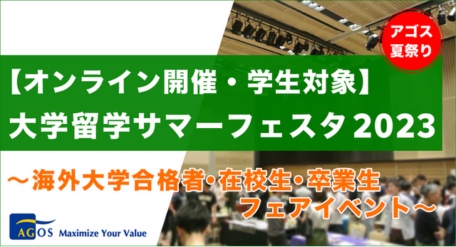 海外トップ大学・大学院留学準備指導校を運営する株式会社アゴス・ジャパン(取締役会長:横山 匡、本社:東京都渋谷区)は、2023年7月17日(月・祝)に、ハーバード大学、ブラウン大学、トロント大学、スミスカレッジ、ポモナカレッジ等、欧米総合大学・リベラルアーツカレッジトップ校に現在海外大学に留学中の在校生、今秋から進学する学生が参加するオンラインイベント「大学留学サマーフェスタ2023」を開催いたします。