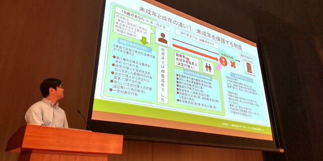 未成年と成年の違いや保護者との関わりについて、ひとつひとつ関連する法律を示した後、18歳成年が気を付けるべき契約における責任の発生や、法律行為の取り消しの難しさなどを、櫻井弁護士が解説しました。