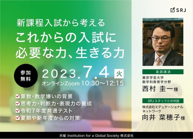 ICT教材の企画開発・販売を行なう株式会社SRJ(本社:東京都中央区、代表:堀川直人、以下「SRJ」)は、2023年7月4日、全国の学習塾・スクール・学校関係者を対象に、無料オンラインセミナー『新課程入試から考えるこれからの入試に必要な力、生きる力』を開催いたします。