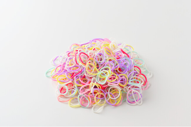 ゆめかわ気分たっぷりのピンク(2種)、ミント、パープル、イエロー、白、クリアの7色のゴム入り。約600本とたっぷり輪ゴムが入っているので、心ゆくまでアクセサリーをつくることができます。