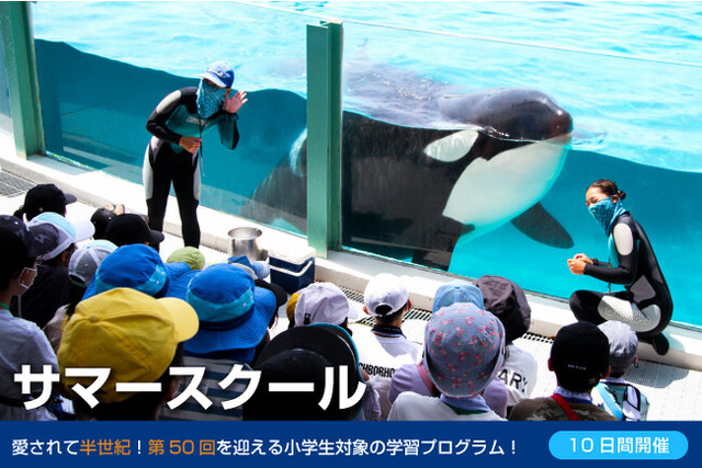 「サマースクール」は、鴨川シーワールド開業当初の1973年から開催している、小学生を対象とした学習プログラムで、今年で50回目を迎える大人気プログラムです。飼育員の解説を聞きながら、海の生き物について観察し、気になることがあればその場で質問をすることができます。シャチやイルカを間近で観察するだけでなく、ヒトデやヤドカリなどに触れたりと、本物の生き物とのふれあいを通して楽しく学ぶことができるため、有意義な夏の学習として多くの子どもたちが参加しています。