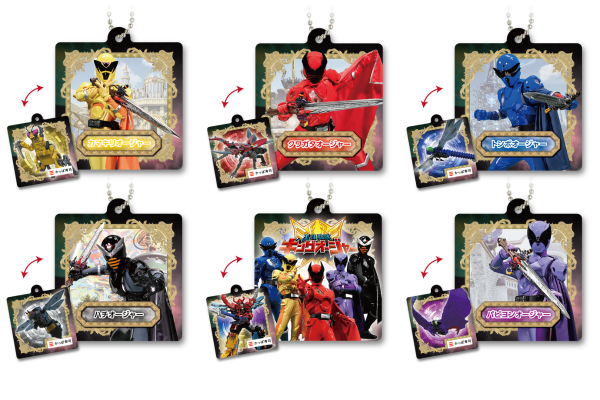 「オリジナルチェンジングキーホルダー」の絵柄は、「クワガタオージャー」「トンボオージャー」「カマキリオージャー」「パピヨンオージャー」「ハチオージャー」、そして「5人の王様」がプリントされた全6種類です。それぞれの王様のキーホルダーを傾けると各王国の守護神であるシュゴッド(昆虫型機械生命体守護神)に、「5人の王様」のキーホルダーはシュゴッドが合体した最強ロボ「キングオージャー」に絵柄が変わります。お会計2,000円(税込)ごとに、キーホルダーを1個プレゼントいたします。(絵柄はお選びいただけません。)