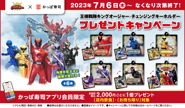ぜひ、この機会にかっぱ寿司アプリをダウンロード&会員登録していただき、『王様戦隊キングオージャー』コラボでしか手に入らないかっぱ寿司限定の「オリジナルチェンジングキーホルダー(全6種)」を手に入れてください。