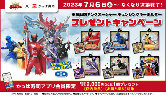かっぱ寿司店内でのご飲食、またはお持ち帰りにて2,000円(税込)以上ご利用いただき、お会計時にレジにて公式アプリ内の「バーコード付引換券」をご提示いただいたお客様に、かっぱ寿司限定デザインの『王様戦隊キングオージャー』の「オリジナルチェンジングキーホルダー」をプレゼントいたします。