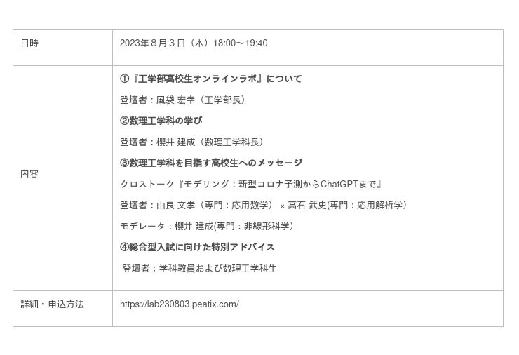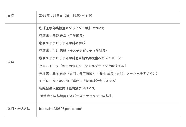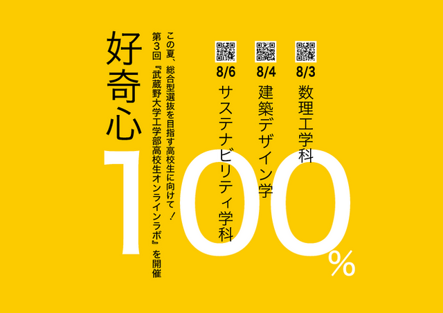 武蔵野大学工学部(東京都江東区/西東京市)は、全国の高校生および受験生を対象とした『工学部高校生オンラインラボ』を2023年8月3日(木)~6日(日)にかけて全3回開催します。キーワードは「好奇心100%」。工学部を構成する3分野(サステナビリティ、数理工学、建築デザイン)の教員がそれぞれのテーマで工学の魅力と可能性を高校生にわかりやすく紹介します。