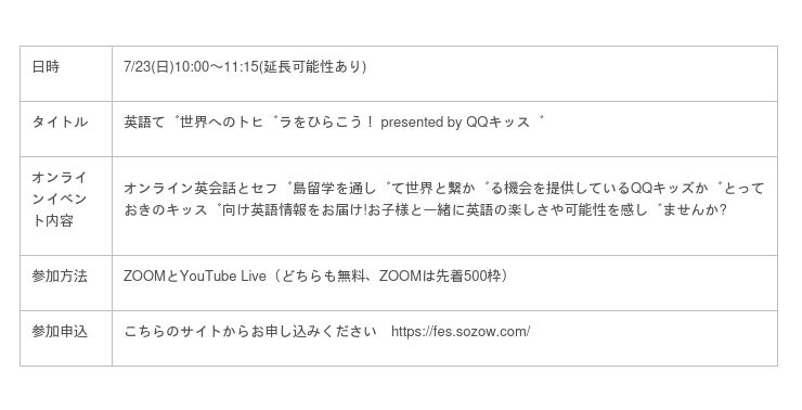 株式会社QQEnglish (本社:東京都渋谷区、代表取締役:藤岡 頼光)が提供する「こども専門オンライン英会話QQキッズ」は、SOZOW株式会社(所在地:東京都品川区、代表取締役:小助川 将)が株式会社テレビ朝日と共同開催する子どもが夢中に出会える日本最大級の親子体験型オンラインフェス「SOZOW FES 2023 SUMMER with テレビ朝日」に参画し、2023年7月23日(日)10時より、QQキッズ提供のオンラインライブ「英語で世界へのトビラを開こう!」を配信します。
