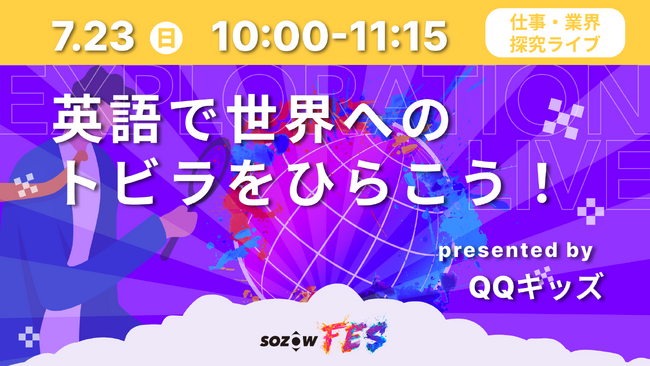 QQEnglish/QQキッズは、これまで世界中の生徒に向けてオンライン英会話とセブ島留学を提供してまいりました。この度、SOZOW FESに参画致し、英語を学ぶ意義や英語で広がる世界・可能性についてのライブセッションを行います。