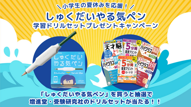 この度、コクヨ「しゅくだいやる気ペン」購入者を対象に、増進堂・受験研究社の「厳選学習ドリルセット」を抽選で20名様にプレゼント致します。5分間復習や粘り強く考えるセンスを磨くドリルなど、楽しく学べる教材を厳選いたしました。「しゅくだいやる気ペン」と学年に合わせた学習ドリルとを一緒にお使いいただくことで、家庭学習の習慣づくりや学力アップのお手伝いを致します。