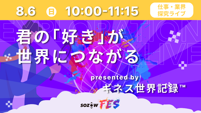 「世界をよりおもしろく、楽しく、ポジティブな場所にする」ことをブランドの目的に掲げるギネス世界記録(TM)は、「子どもの興味が広がり、夢中になれるものとの出会いの場を作る」という「SOZOW FES 2023 Summer with テレビ朝日」のイベント主旨に共鳴し、このたびの参加となりました。オンラインライブでは、日本人で初めてのギネス世界記録公式認定員となり、過去に300以上の記録を審査してきた石川が、思わず人に教えたくなる世界一、試したくなる世界一を紹介しながら、やりたいこと、好きなことを突き詰めて、世界一となった挑戦者の話から「好き」のパワーについて子どもたちと考えます。