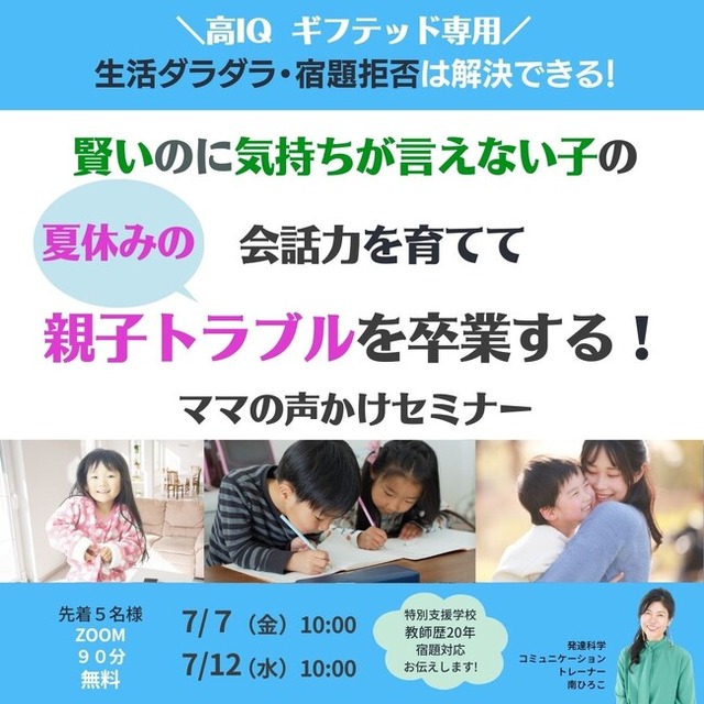はじめまして 発達科学コミュニケーショントレーナー南ひろこです。ギフテッドキッズが伝わる会話力を身につける専門家として活動しています。この度、『\高IQギフテッド専用/生活ダラダラ・宿題拒否は解決できる!賢いのに気持ちが言えない子の会話力を育てて夏休みの親子トラブルを卒業する!ママの声かけセミナー 』を開催いたします。